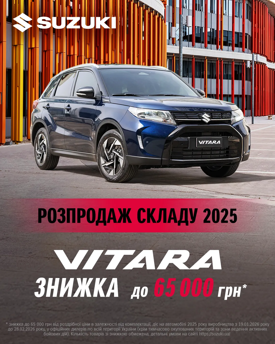 Офіційний дилерський центр ТОВ «АВТО КРОК"» оголошує про знижку до 65 000 грн* , яка діє з 19 січня 2026 року до 28 лютого 2026 року на автомобілі SUZUKI VITARA 2025 року виробництва. Кількість автомобілів обмежена – встигніть скористатись вигідною пропозицією.